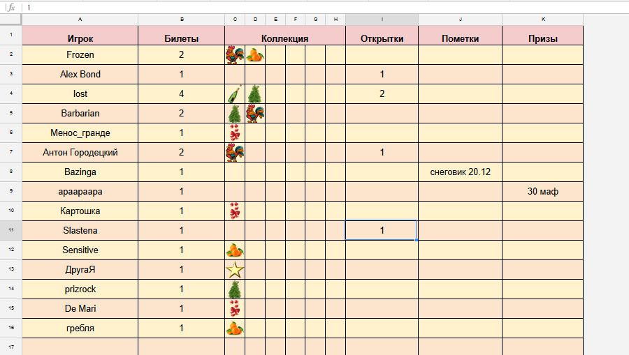 "Открытки" - 115 ячейки, в которых находятся открытки. Каждый, кто соберет 9 открыток, получит квадрат в инфу. Собирать можно несколько раз.